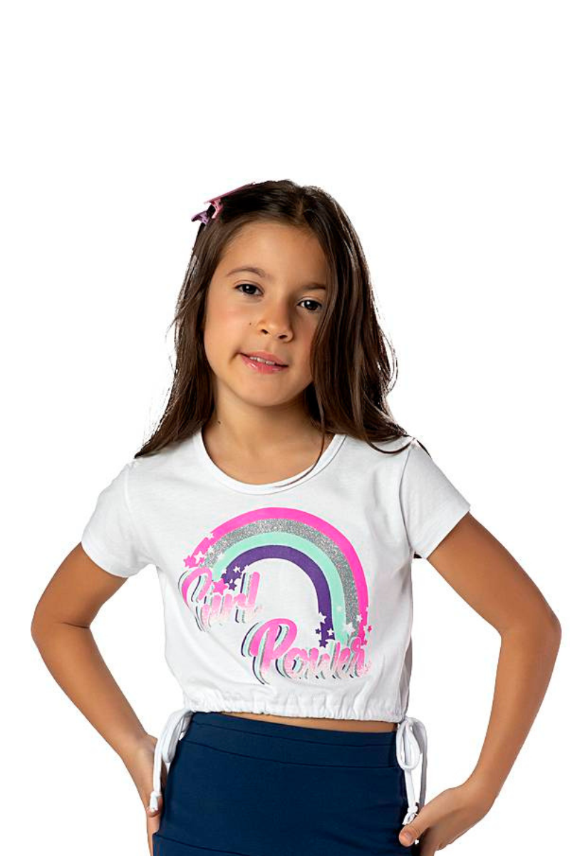 Cropped infantil branco com estampa arco íris e aplicação em glitter