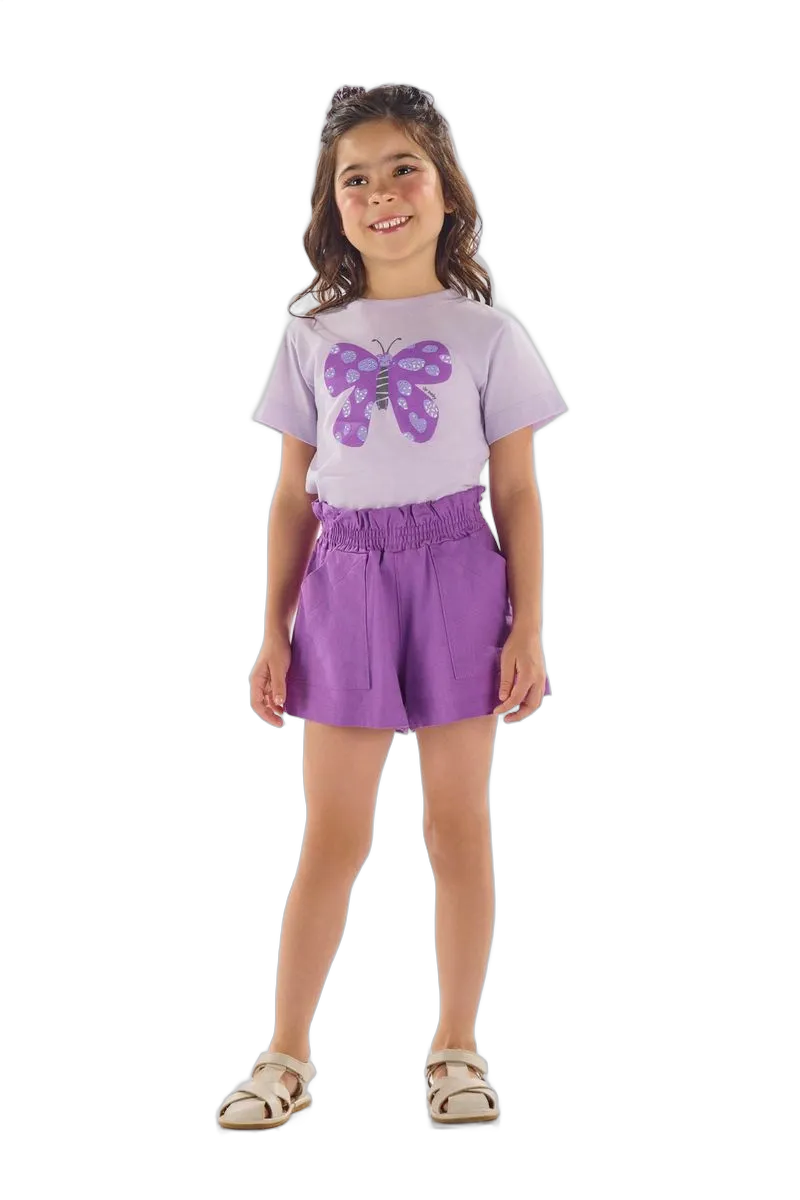Blusa infantil para menina confeccionada em meia malha (algodão e poliéster), com modelagem confortável e decote redondo em ribana canelada. Conta com estampa frontal de borboleta com aplicação de strass furtacor, que traz brilho delicado ao visual. Ideal para looks casuais com charme e leveza, perfeita para os dias mais quentes