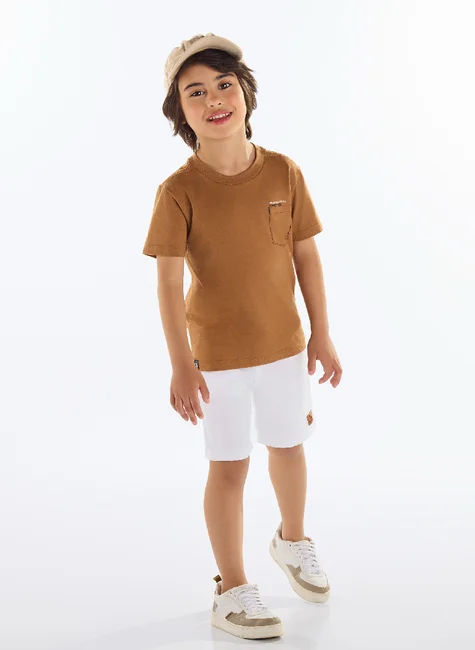 Camiseta infantil masculina feita em meia malha confortável (algodão), ideal para o uso diário. A peça apresenta bolso no peito com estampa discreta, gola redonda em ribana canelada e acabamento em costura dupla nas barras. Um modelo versátil e estiloso para diversas ocasiões.