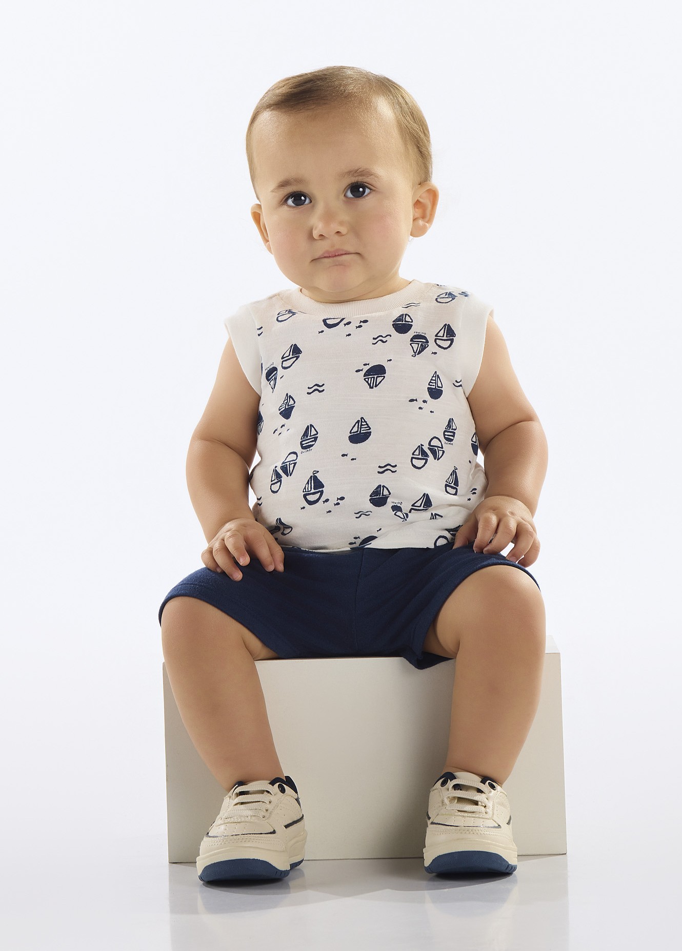 Conjunto para bebê menino composto por uma regata confeccionada em meia malha flamê (100% algodão) e uma bermuda em moletom sem felpa (algodão e poliéster), ideal para os dias mais quentes. A regata possui estampa com diversos barquinhos, decote redondo e cavas em ribana para maior conforto. A bermuda é lisa, conta com cós elástico e cadarço decorativo na cintura, trazendo praticidade ao vestir. Um conjunto leve, divertido e confortável para as aventuras do dia a dia.