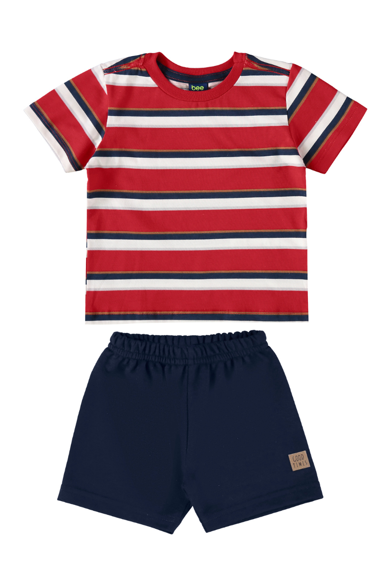 Conjunto Bebê Menino composto por camiseta de meia manga 100% algodão com listras vermelhas e marinho. Bermuda de moletom com elástico na cintura na cor marinho combinando com a camiseta.