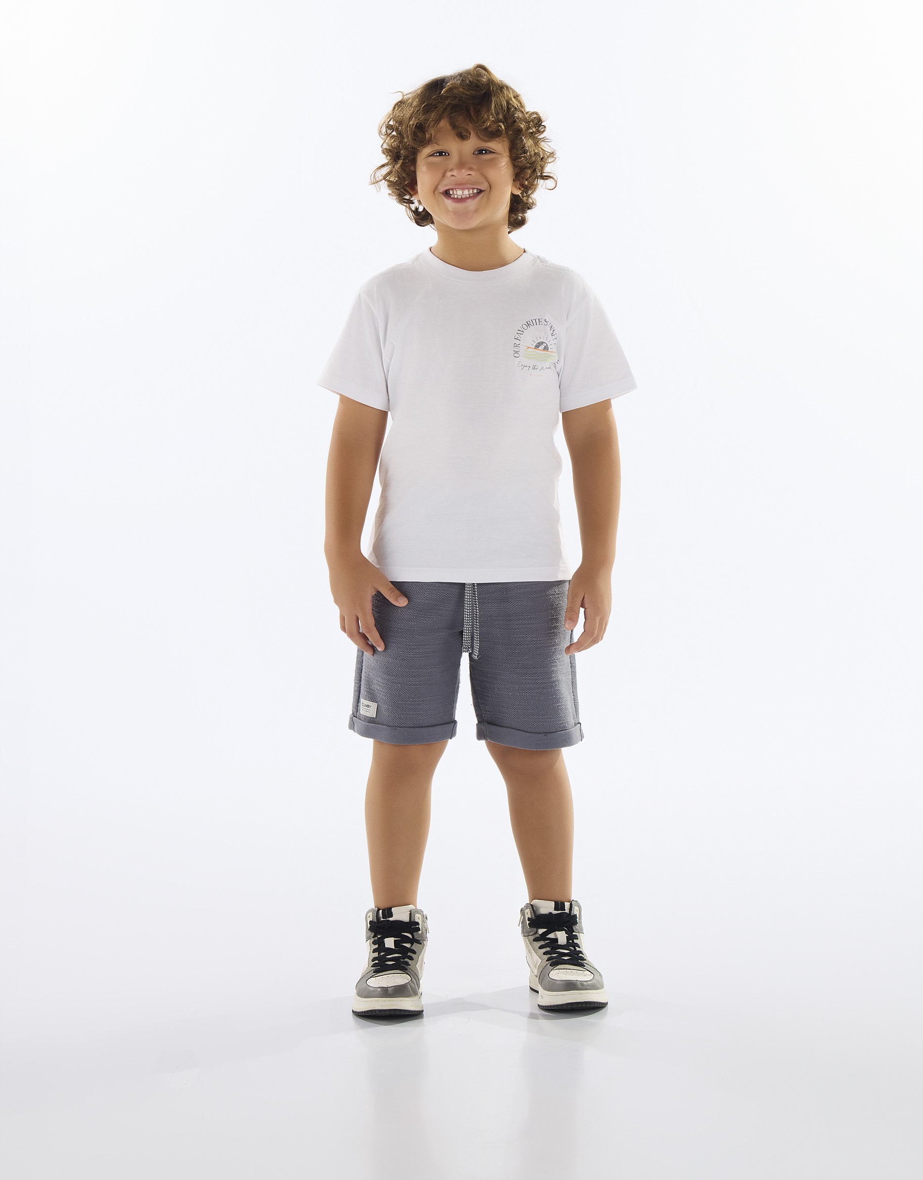 Conjunto infantil masculino composto por camiseta em meia malha (algodão) e bermuda em moletom flamê rústico (algodão). A camiseta traz estampa no peito e gola redonda em ribana canelada. A bermuda possui cós com elástico e cadarço funcional, bolsos laterais e acabamento com barra dobrada para um visual moderno. Ideal para momentos passeios com muito conforto.