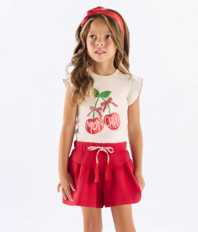 Delicado e estiloso, este conjunto infantil para menina é composto por blusa em meia malha (algodão), com mangas curtas franzidas e acabamento em picueta, gola redonda em ribana e estampa de cerejas com aplicação de strass. Acompanha short em moletom sem felpa (algodão e poliéster), com cós elástico, cadarço decorativo e recorte franzido. Uma ótima opção para as meninas aproveitarem cada momento com conforto e liberdade.