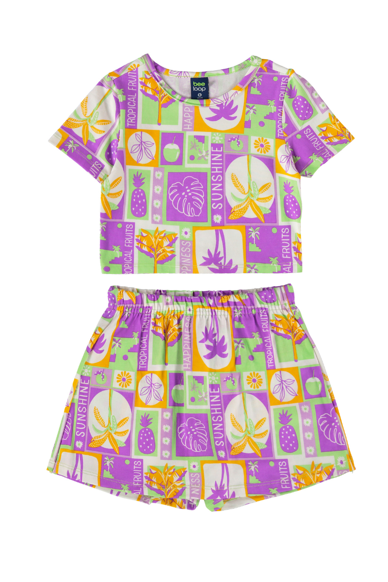 Conjunto infantil para menina, com blusa cropped e short-saia confeccionados em cotton, ideal para os dias mais quentes. As duas peças possuem uma estampa moderna e tropical, trazendo frescor e energia ao visual. O short-saia conta com elástico na cintura, proporcionando um ajuste confortável e prático.
