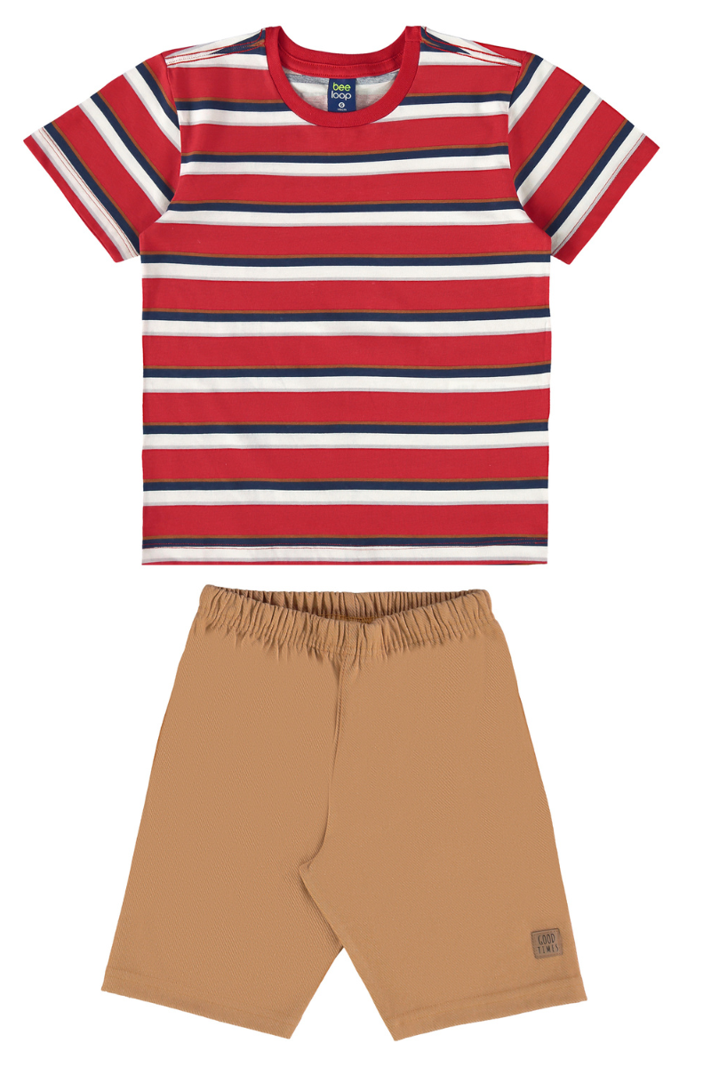 Conjunto Infantil de Menino composto por camiseta de meia manga 100% algodão com listras vermelhas e marinho. Bermuda de moletom com elástico na cintura na cor marrom ocre.