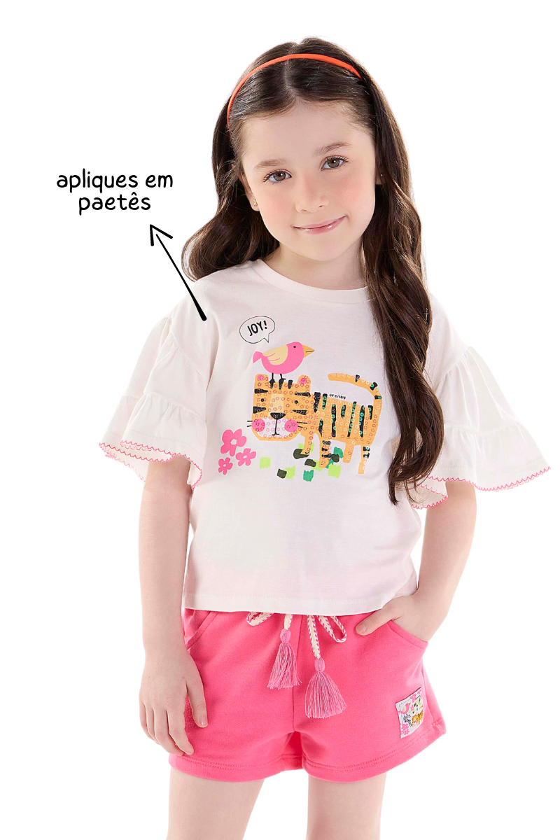 Blusa 100% algodão em meia manga com babadinhos, decote redondo, estampa animais com apliques em paetês.