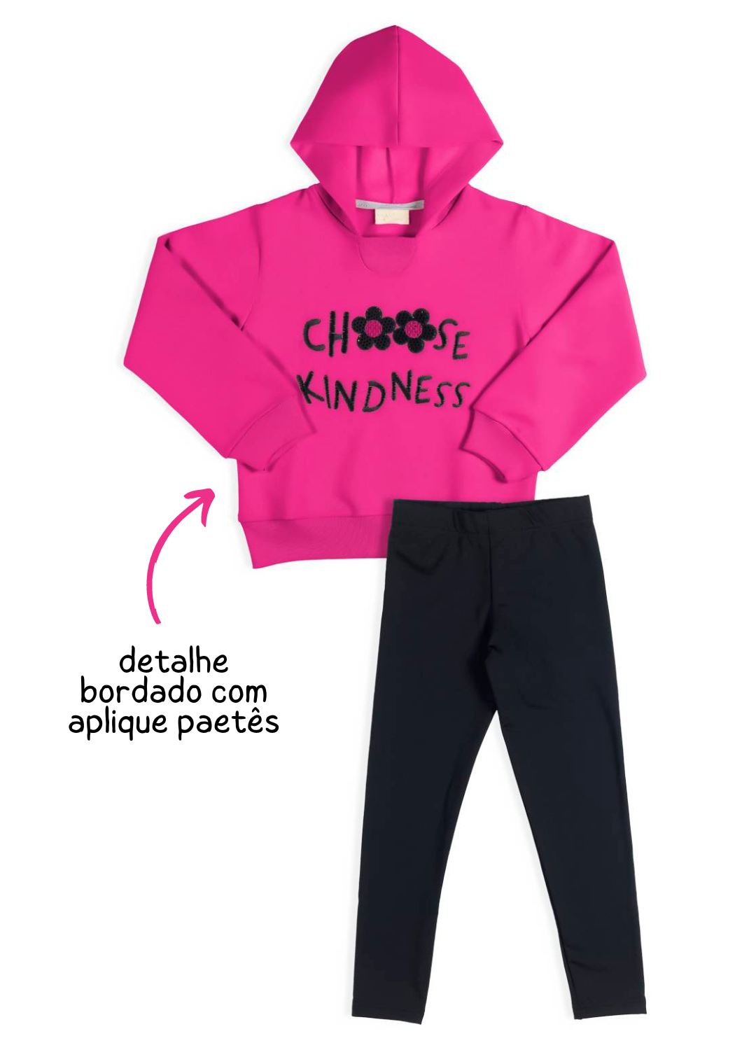 01 - Blusão com capuz em moletom flanelado na cor pink com bordado preto e apliques em paetê