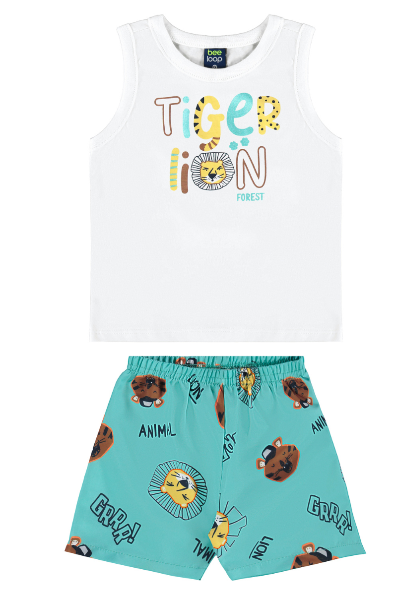 Conjunto de Bebê Menino com Regata branca em meia malha e estampa Tigre/Leão.
