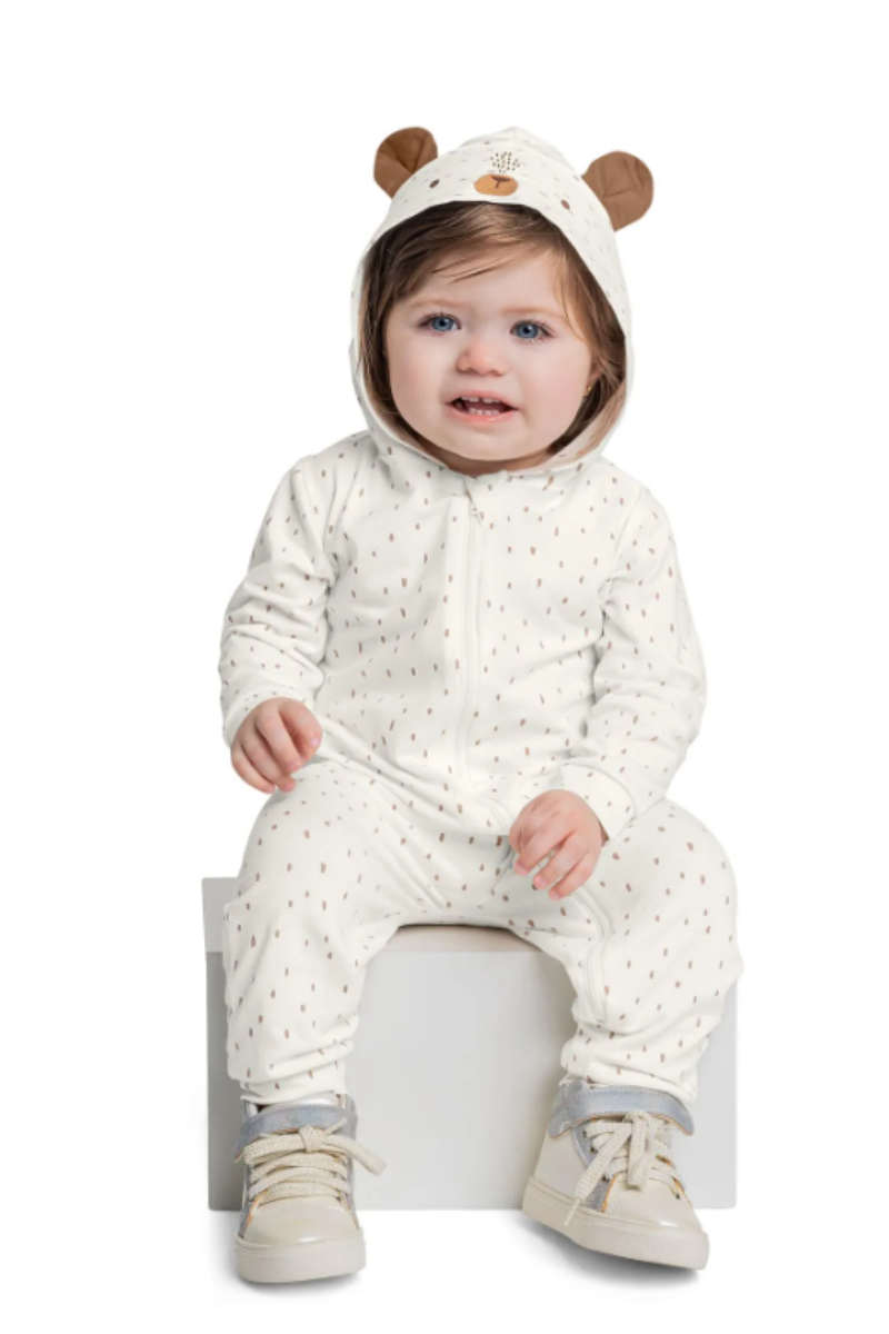 Macacão para bebê, unissex, confeccionado em cotton, garantindo conforto e maciez para o bebê. Ele possui um capuz com estampa, bordados e orelhinhas de ursinho, trazendo um toque extra de fofura. Ideal para qualquer ocasião, mantém o bebê aconchegado e estiloso, com fechamento prático para facilitar a troca de fraldas.